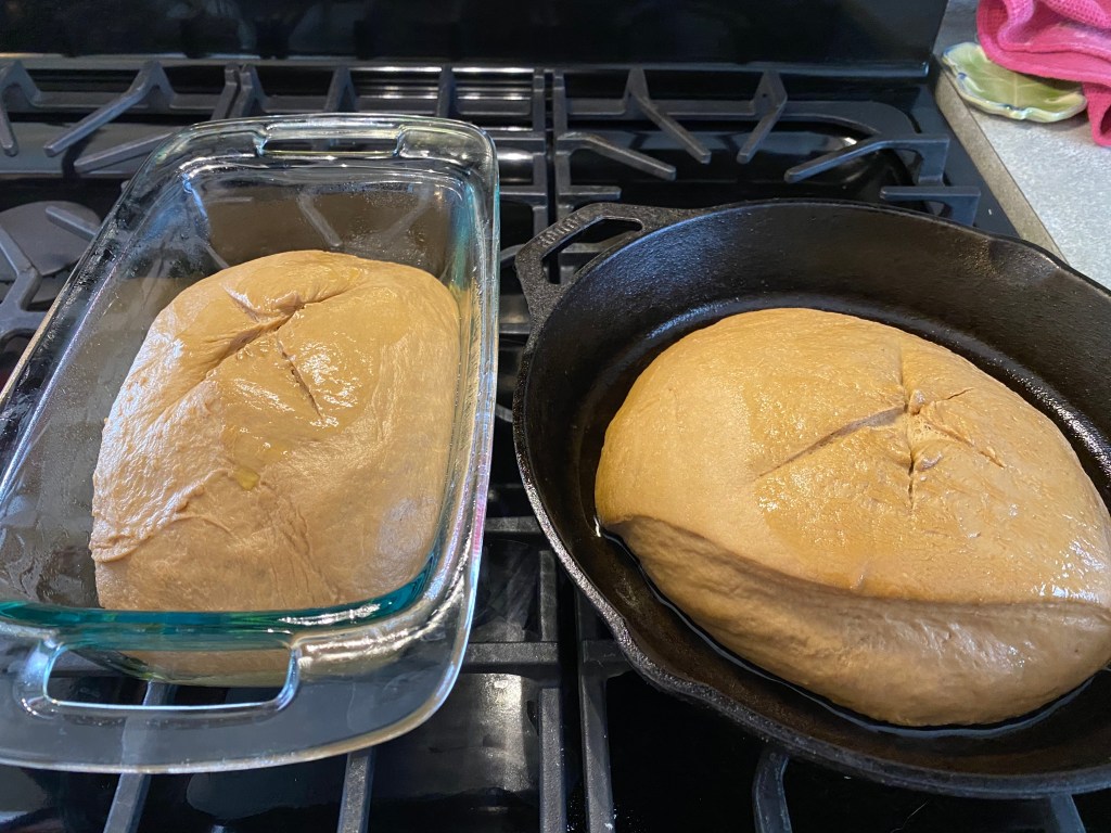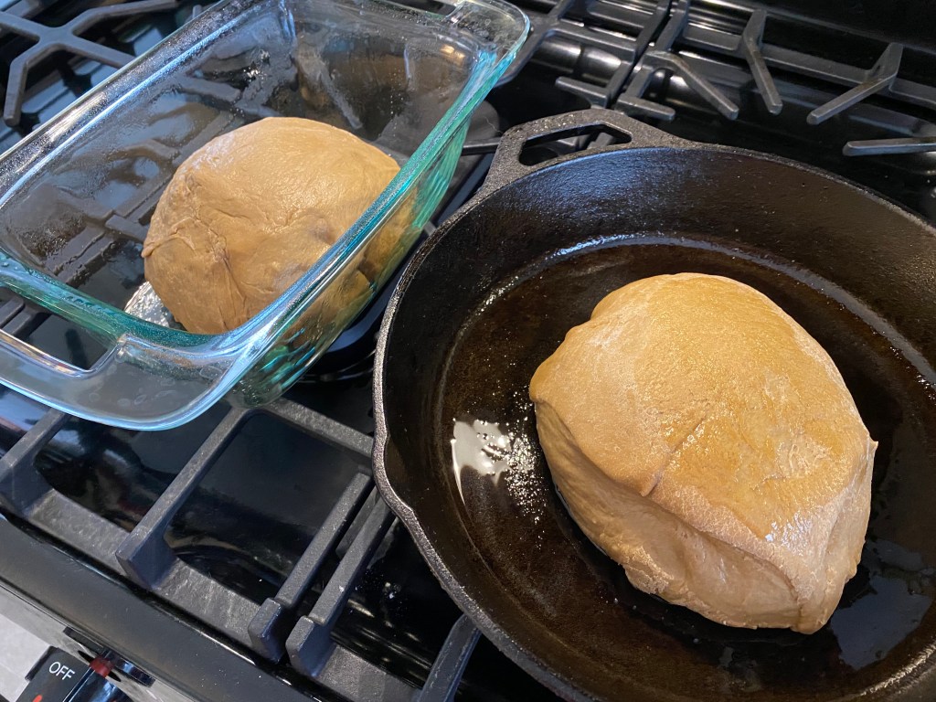 I then split the dough into two. One went in the usual cast-iron skillet, but I chose to do the second in a regular loaf pan.