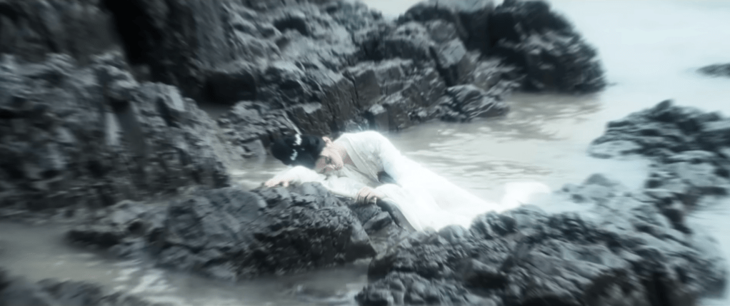 Wen Xiao staggered to run toward that reef rock, unintentionally catching a sight that brought her to a sudden stop: Zhao Wan’er’s clean, white skirt soaked in the foul sea water; a massive, horrible bloodstain at her chest; her body powerless like paper floating in the waves with not even the slightest hint of life. Her face was deathly pale, her lips black; her eyes still open, like heavy, dark clouds; pupils already round, ash-gray voids.