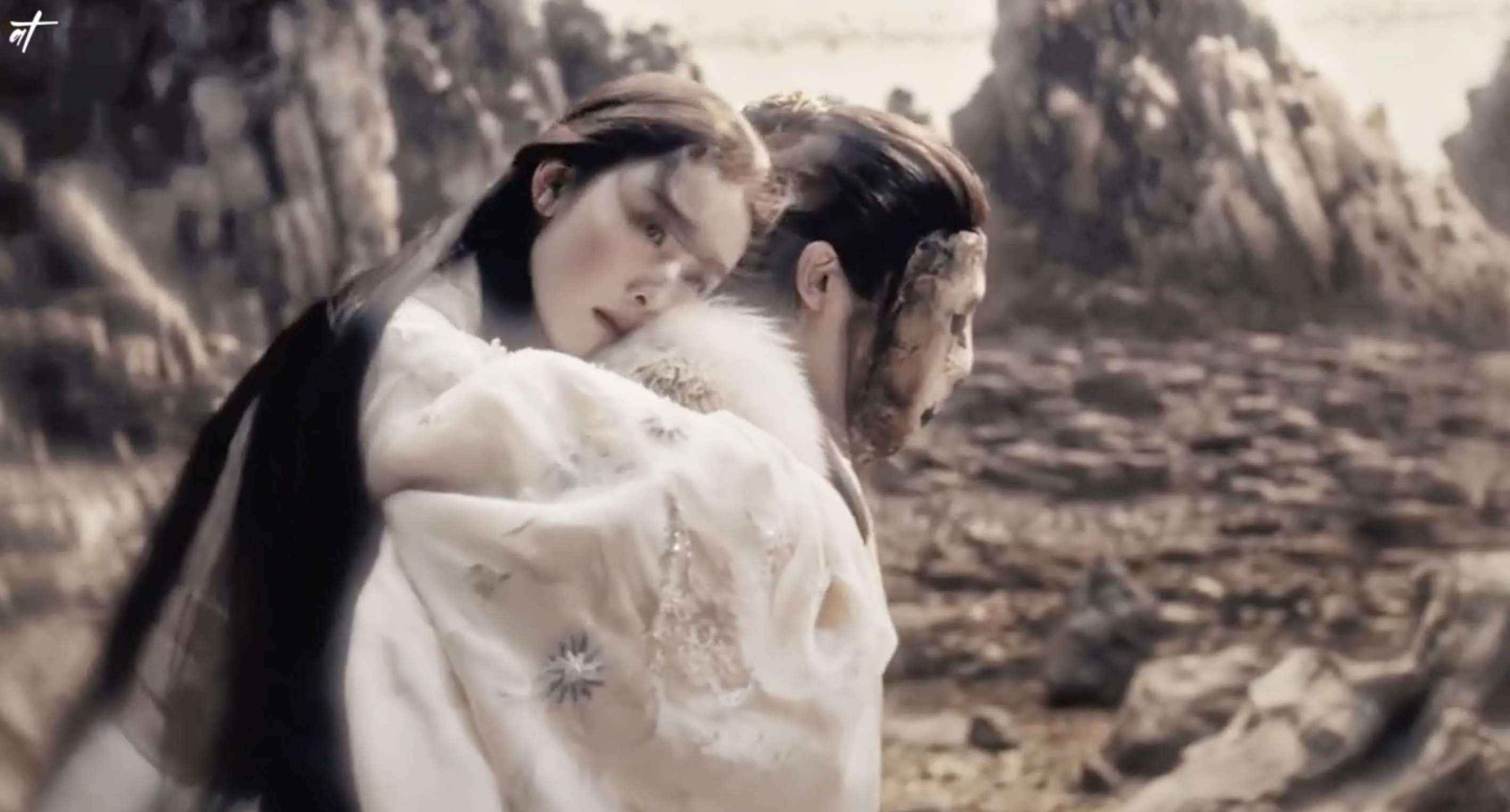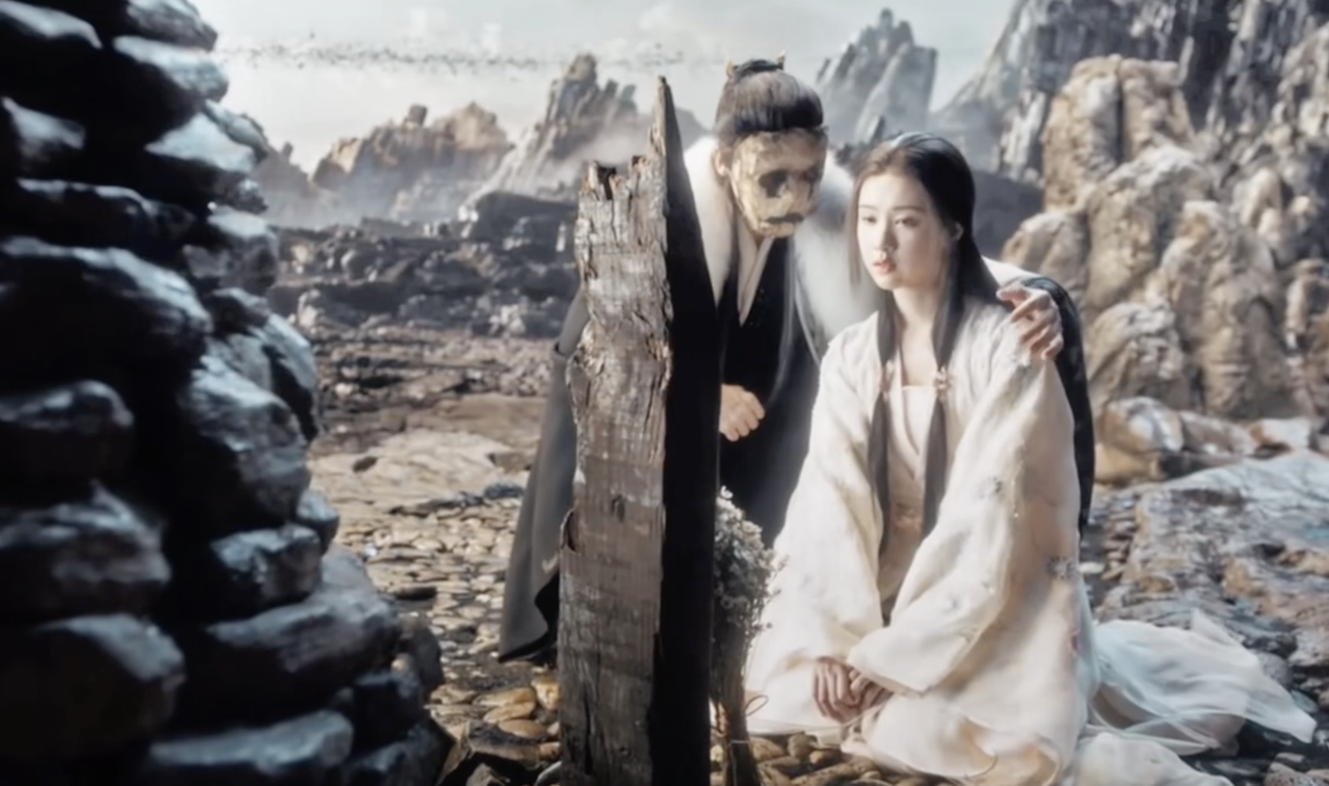 Wen Xiao brought a bunch of wildflowers to place in front of Zhao Wan’er’s grave. After, she knelt there in the dirt, ruined and silent. The figure of a tall, imposing man came to stand behind her. This man wore a mask over his face. It bore a decorative pattern, burned at the edges, not really hideous, but still strange. Out of the ordinary, this mask changed with his mood. At this moment, his mood matched Wen Xiao’s, so the corners of the mouth on this fierce mask turned faintly downward, endlessly heartbroken.
