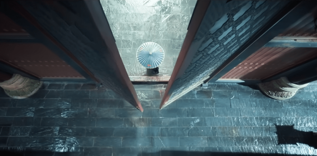 From the handle of his umbrella, Zhao Yuanzhou withdrew a sword. Then, he immediately turned the umbrella around and stabbed right at Zhuo Yichen. The umbrella opened to block Zhao Yuanzhou’s body and face. Zhuo Yichen flashed a look: his hand was already empty—his long sword under the umbrella like sliding into it as if into a scabbard.